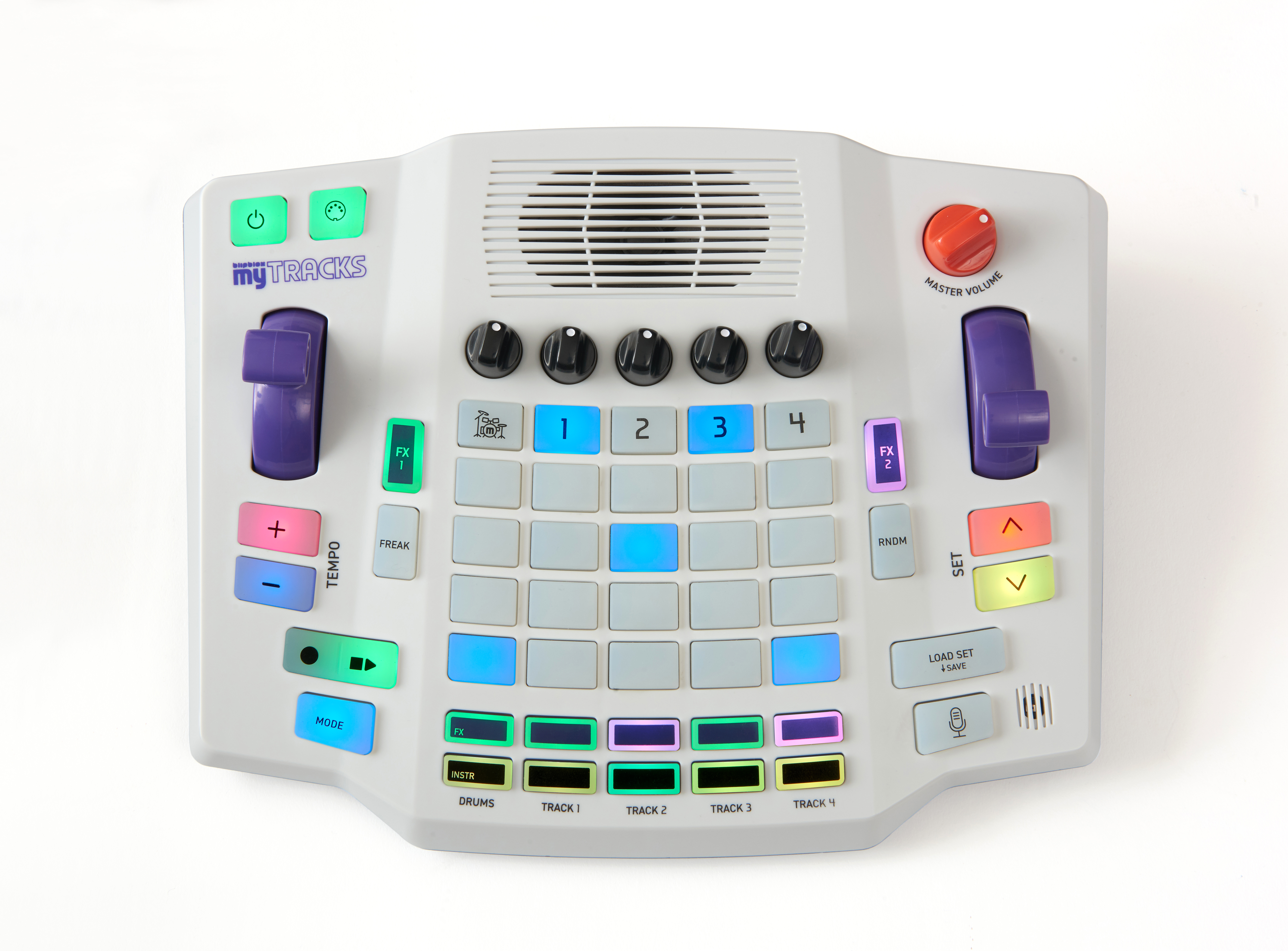 The Blipblox myTRACKS is more than just a drum machine or a basic sampler–it's a complete music production studio. It features a built-in microphone for sampling, two FX processors, five tracks, and 25 playpads that trigger over 50 real acoustic, electronic, and percussive instrument sounds.